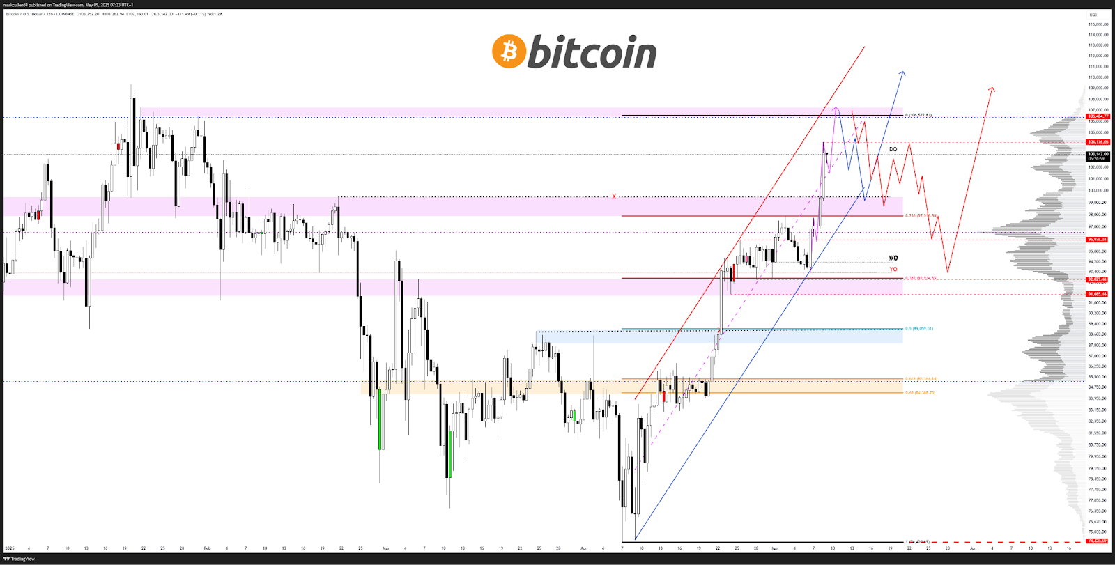“I am liking how these Fibonacci retracement levels line up with support, makes me think $BTC has another leg to 106K+ before it corrects.”