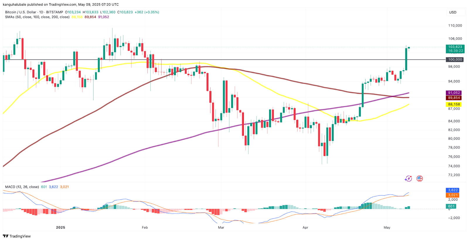 Bitcoin was up 4.3% on May 9, after breaking $100,000 for the first time since February.