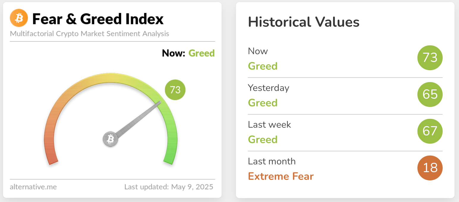 BTC/USD rose as high as $104,150 during the late New York trading session on May 8, according to data from Cointelegraph Markets Pro and Bitstamp. Crypto market sentiment, as measured via the Crypto Fear & Greed Index, has increased from 65 to 73 in the last 24 hours, suggesting increasing “greed” among investors.