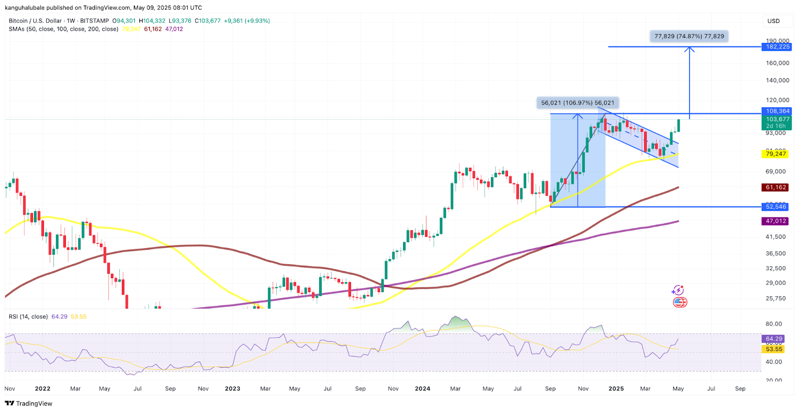 A bull flag on the weekly chart suggests a $182,200 target, with analysts predicting Bitcoin’s price can go as high as $1 million in 2025.