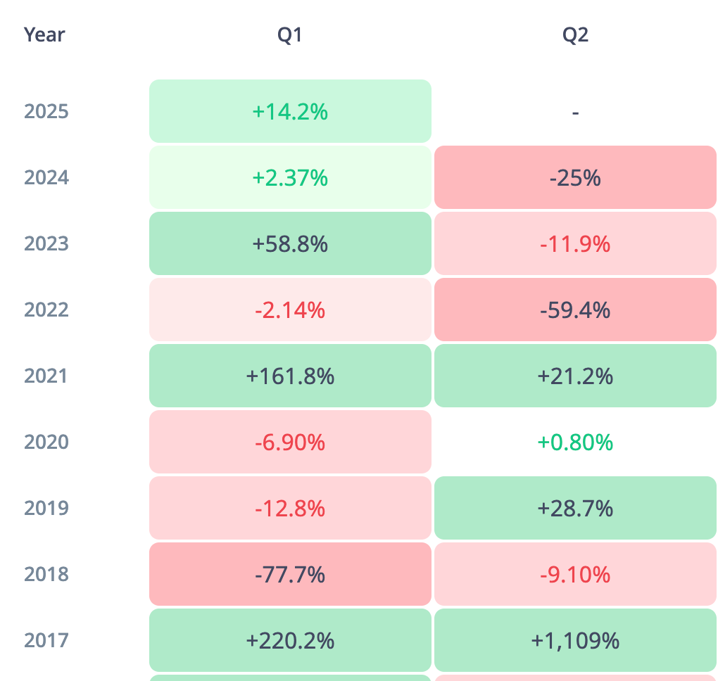 Data from CryptoRank reveals that throughout the years, the second quarter has been both bullish and bearish. While the last three years have been bearish, XRP surged by a staggering 1,109% during the second quarter of the year 2017. As seen in the below image, the asset recorded a 14.2% uptick during the first quarter of 2025, which is a good start to the year.