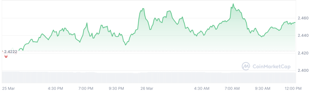 In the last 24 hours, XRP saw a slight rise of 1.41%. The asset went from trading at a low of $2.41 to a high of $2.48 during this time period. At the time of writing, the altcoin was priced at $2.45. The community is hoping to see the cryptocurrency try to reach for the $3 milestone in the coming month.