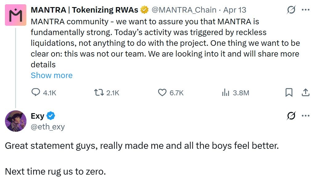 The sudden crash drew comparisons to Terra’s LUNA implosion as traders scrambled for answers. Unverified rumors of insider dumping, forced liquidations, mislabeled wallets and exchange manipulation quickly spread — but Mantra insists it was caught in the middle.
