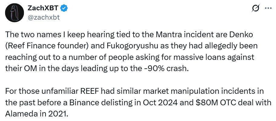 Meanwhile, crypto detective ZachXBT weighed in, claiming that individuals linked to Reef Finance had allegedly been seeking massive OM-backed loans in the days leading up to the crash.
