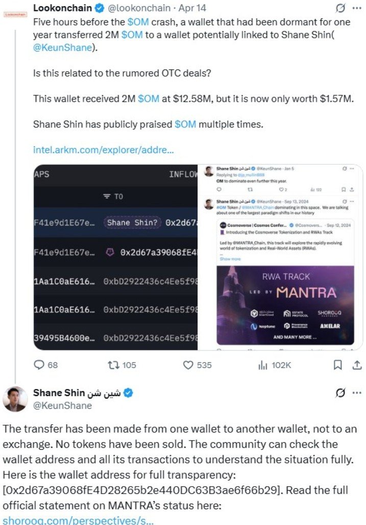 “I think it’s baseless. We posted a community transparency report last week, and it shows all the different wallets,” Mullin said, noting the dual-token setup across Ethereum and the Mantra mainnet. Additionally, he reassured users that OM token recovery is the team’s primary concern.