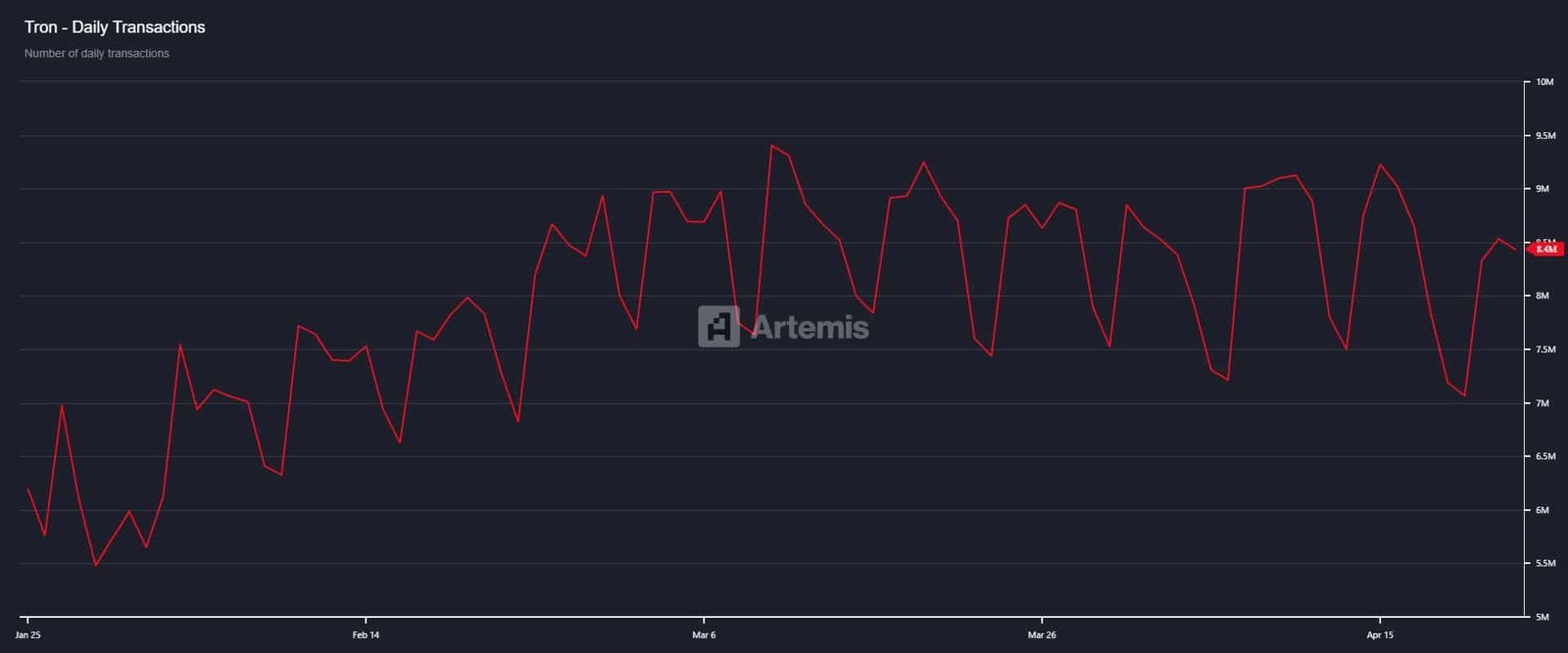 In the past 24 hours, HYPE’s transaction count rose significantly, increasing from 296.3 million to 424.5 million. On the other hand, Tron’s transactions fell by 100,000, from 8.5 million to 8.4 million.