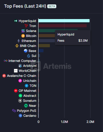 According to Artemis data, Hyperliquid generated $2 million in fees, while Tron generated $1.9 million.