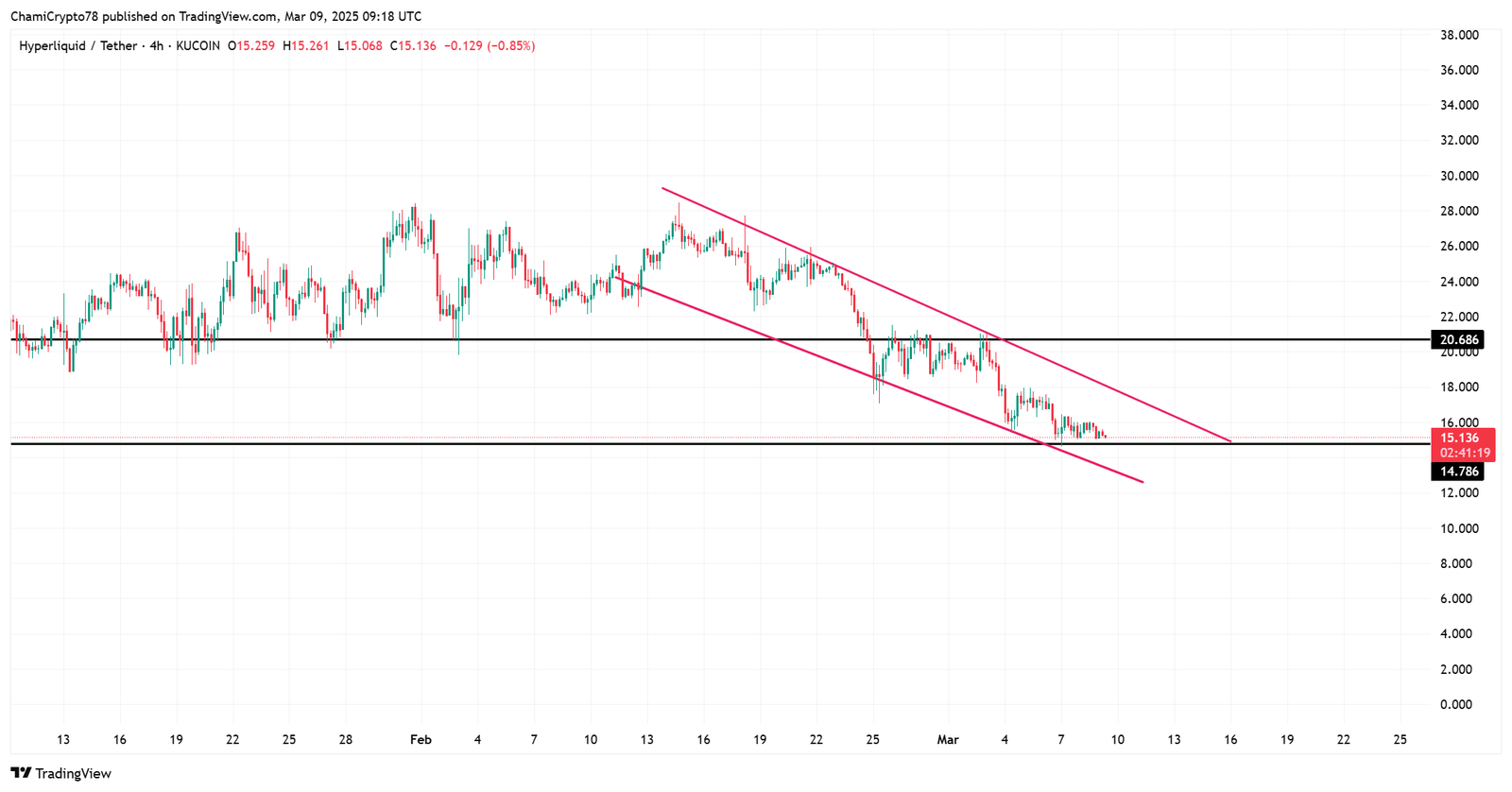 The price was consolidating near the key $15.00 support level at press time, forming a falling wedge pattern. At press time, HYPE was trading at $15.13, marking a 4.12% decrease over the past 24 hours.