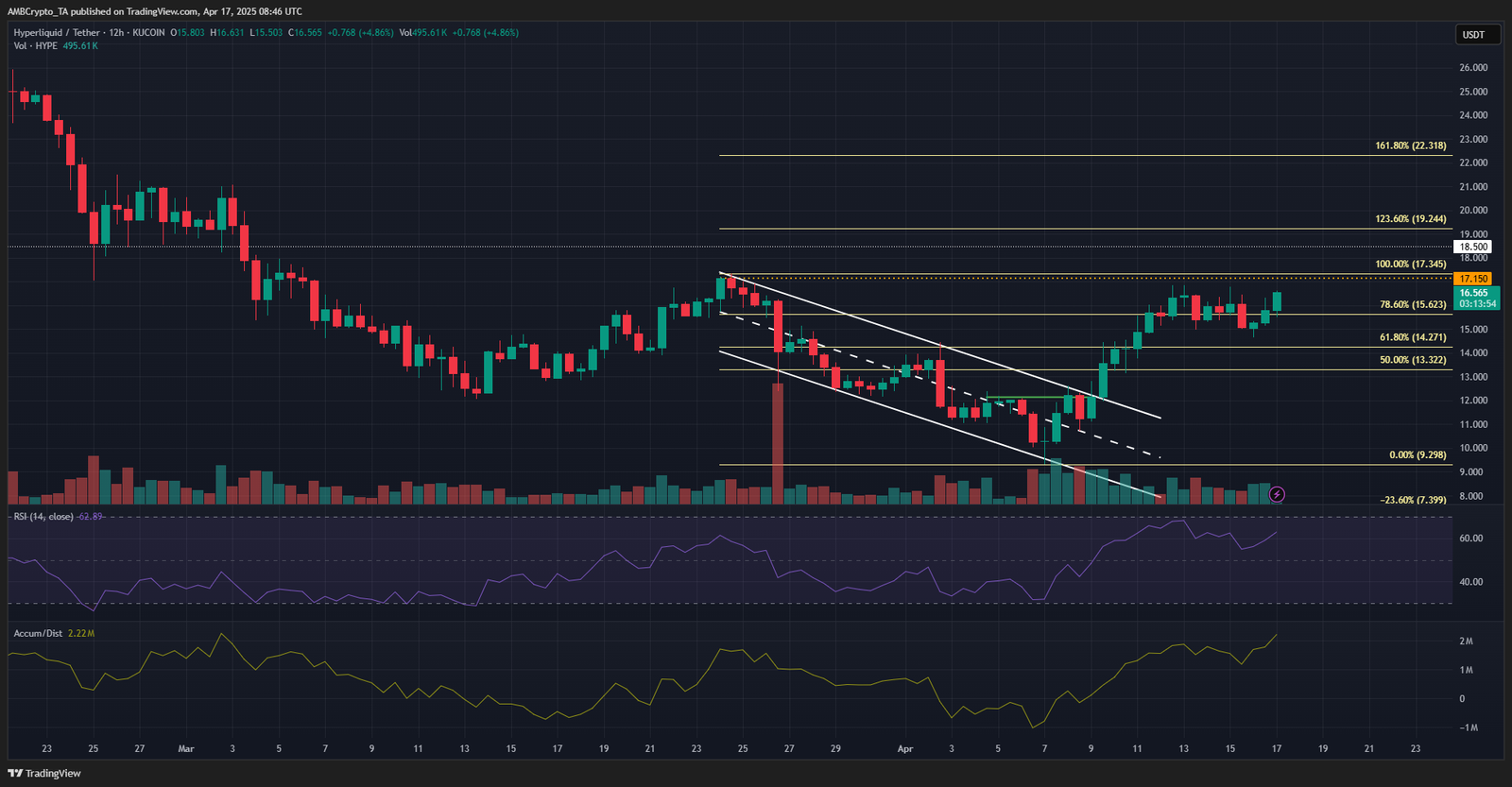 It was approaching the $17.15 resistance that marked the swing high before the descending channel. On the 12-hour chart, HYPE has had a bullish structure since climbing above the lower high at $12.