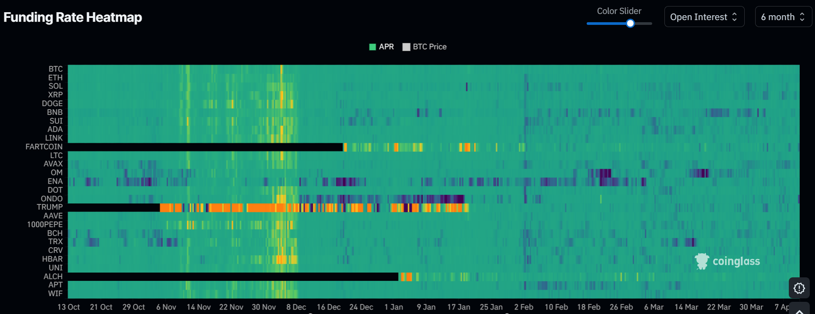 In late 2024, funding rates hit 50-80% (orange), signaling strong bullish sentiment and over-leverage. This often leads to sharp pullbacks in case of liquidations. However, press time funding rates were below 10% across several altcoins, hinting at a stable market that could rally higher under positive catalysts.