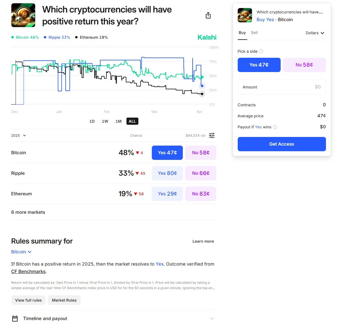 Kalshi is a derivatives exchange regulated by the US Commodity Futures Trading Commission (CFTC). As of April 9, it listed some 50 crypto-related event contracts, including markets for betting on coins’ 2025 highs and lows, as well as on headlines such as US President Donald Trump’s proposed National Bitcoin Reserve.