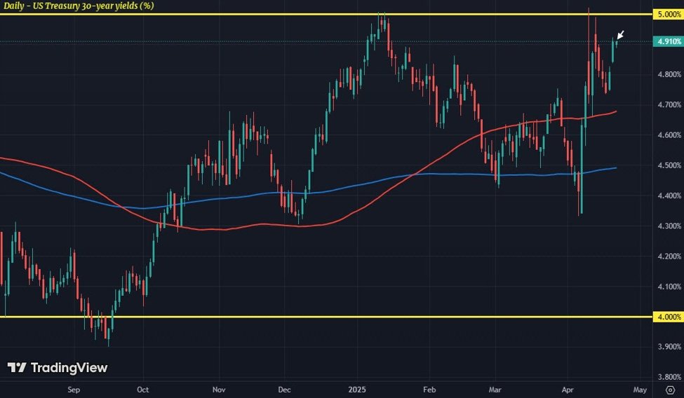 As a reminder, it was the bond market that got Trump to blink with his tariffs pause. And after two weeks of going through the mess, we’re in no better position to where we were back then. This was the situation when 30-year yields were at 4.90% on 10 April:
