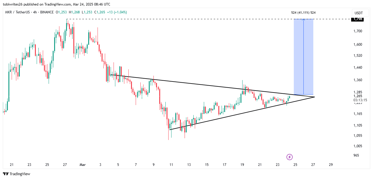 On the chart, MKR appears ready to attempt a bullish breakout from a symmetrical triangle, following the large buy orders. Based on the analysis, if the asset breaks through this resistance, it could surge 41% to reach $1,800.