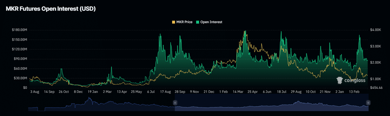 Data from Coinglass shows that MKR’s Open Interest (OI) has steadily risen, reaching $87.80 million in the past 24 hours. This increase indicates more unsettled derivative contracts in the market.