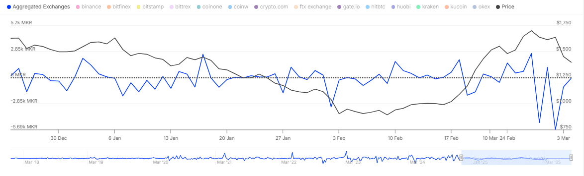 The netflow metric, which tracks buying and selling activity within a given period, shows that 989.63 MKR (worth $1.2 million) was sold.
