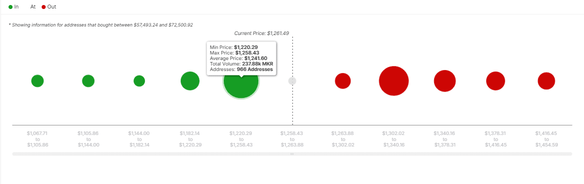 The In/Out of the Money Around Price (IOMAP) indicator, which helps identify potential demand and supply zones, shows that MKR has reacted off a key demand area that could trigger a major rally.
