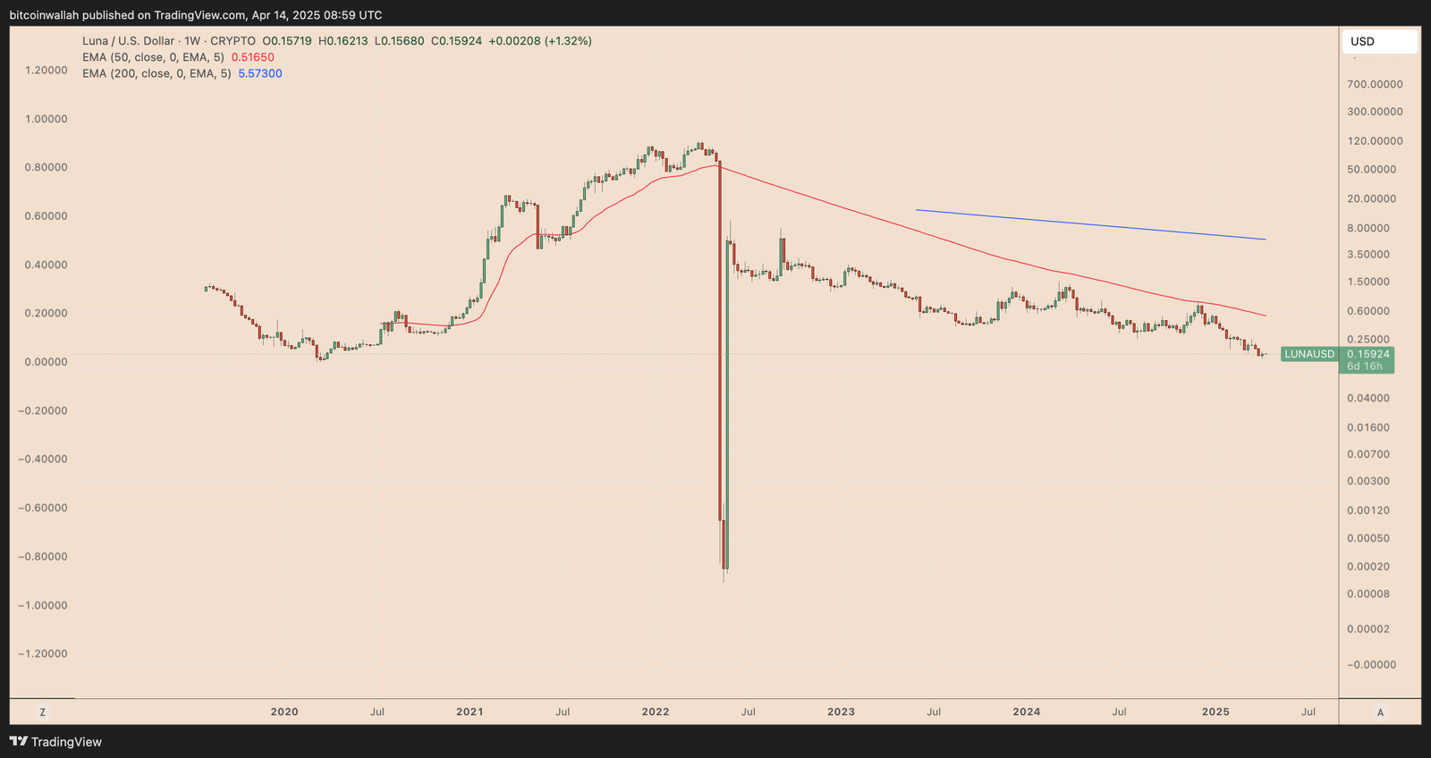 This setup strongly mirrors LUNA’s post-crash behavior. After its sharp decline in May 2022, the price staged a brief recovery but failed to reclaim its 50-week and 200-week moving averages, triggering a deeper and more prolonged downtrend.