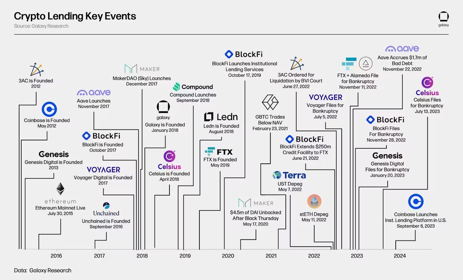 The decline in the crypto lending market started in 2022 when centralized finance (CeFi) lenders Genesis, Celsius Network, BlockFi and Voyager filed for bankruptcy within two years as crypto valuations fell.