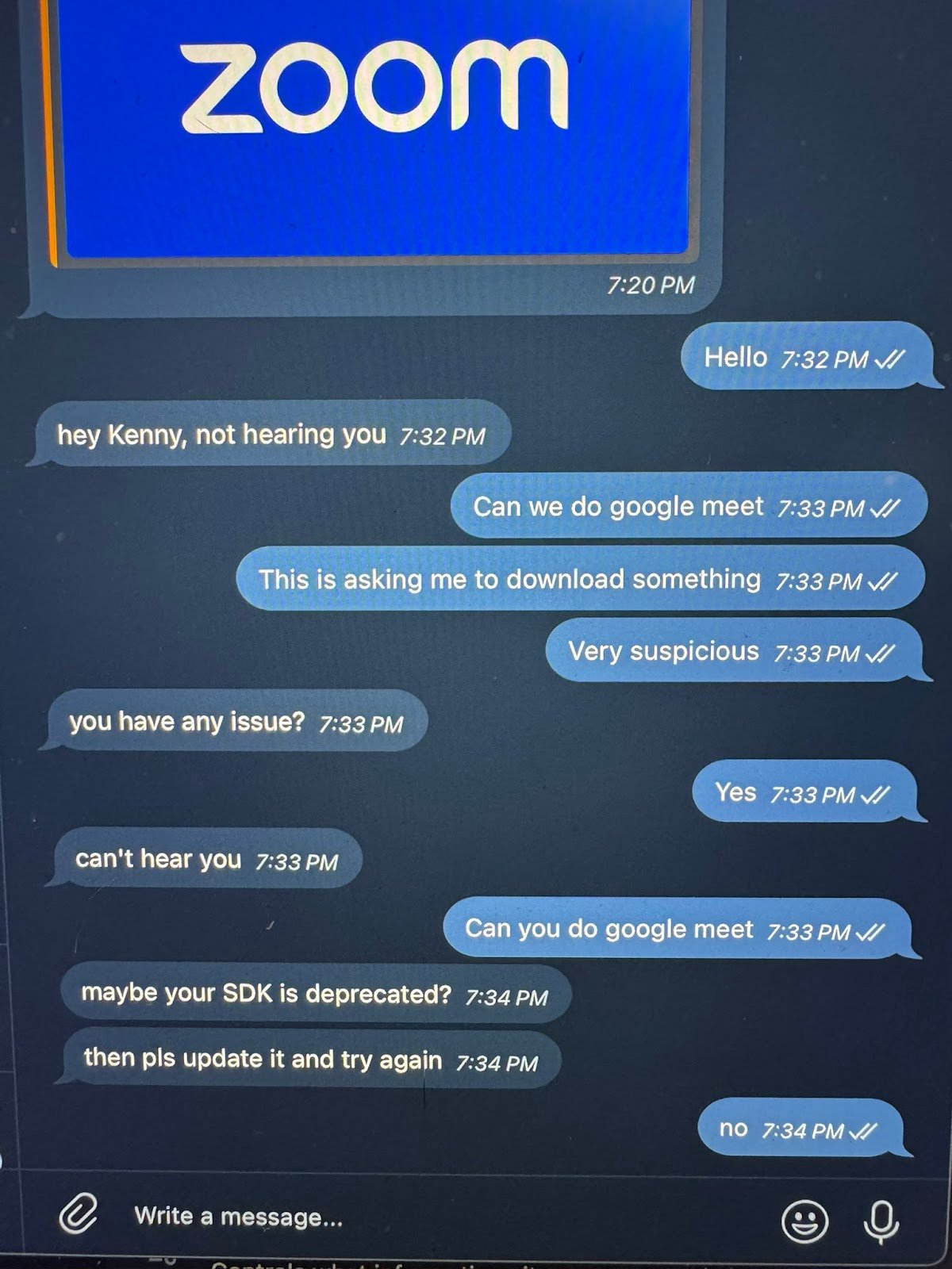 “I could see their legit faces. Everything looked very real. But I couldn’t hear them. It said my Zoom needs an update. But it asked me to download a script file. I immediately left.”
