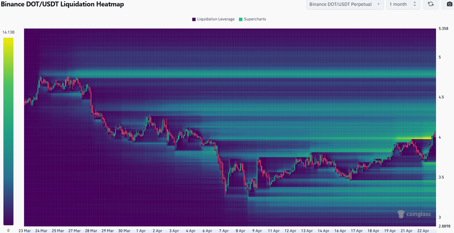 The liquidation heatmap also highlighted the risks of entering long positions now. The $4-$4.18 and the $4.3-$4.4 regions are both magnetic zones for the price. They could pull DOT higher, but they also pose the risk of a bearish reversal thereafter.