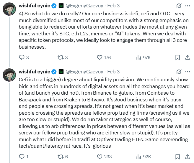Wintermute did not respond to Cointelegraph’s request for comment. But in a February X post, Wintermute CEO Evgeny Gaevoy published a series of posts to share some of the company’s operations with the community. He bluntly stated that Wintermute is not a charity but in the “business of making money by trading.”