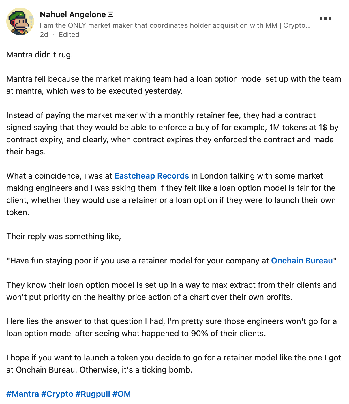 The industry is becoming more aware of the risks tied to loan option models, especially as sudden token crashes increasingly raise red flags. In a now-deleted X post, onchain account Onchain Bureau claimed that a recent 90% drop in Mantra’s OM token was due to an expiring loan option deal with FalconX. Mantra denied the claim, clarifying that FalconX is a trading partner, not its market maker.