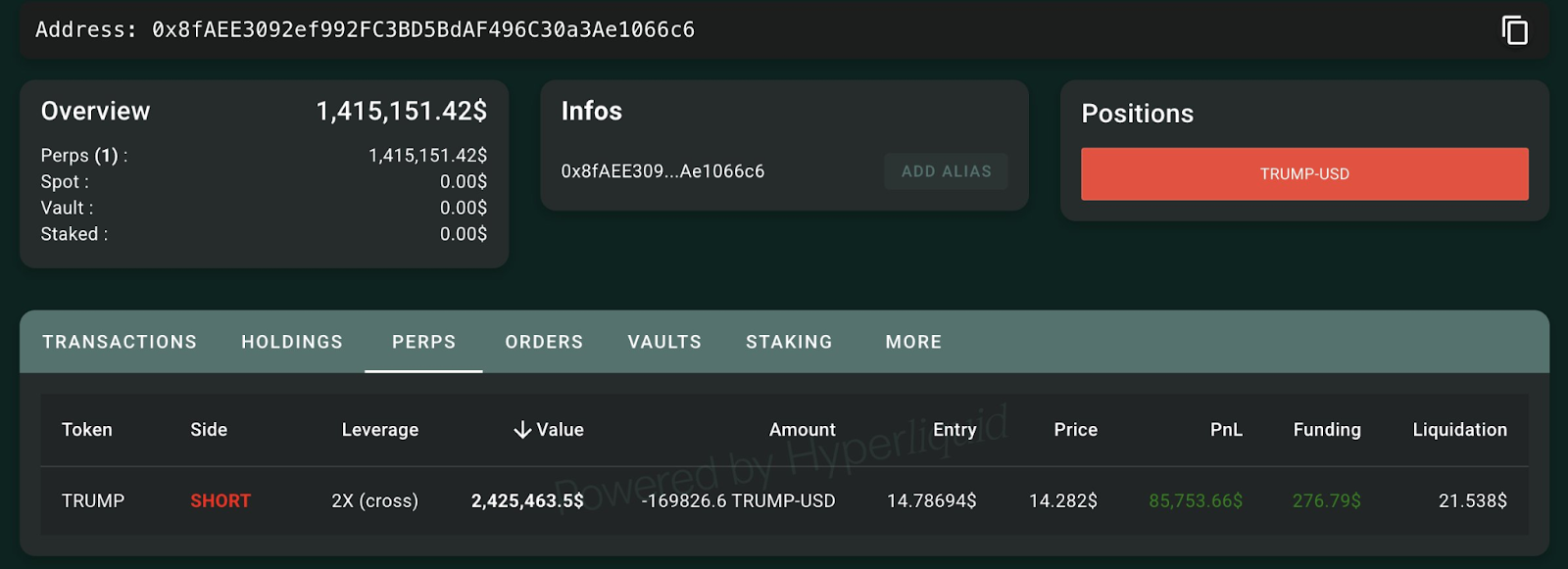 A newly created whale wallet deposited $1.33 million worth of USDC (USDC) stablecoins to open a short position with 2x leverage at $14.7. The short would be liquidated if the Trump token’s price rises above $21.50, according to Lookonchain.