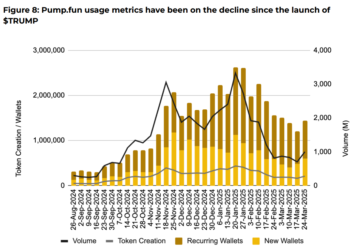 However, the launch of the TRUMP token and its disappointing performance may have marked the end of the memecoin supercycle, which saw the weekly usage activity on memecoin launchpad Pump.fun stage a significant decline — from 2.85 million active wallets on the week of Jan. 20, to just 1.44 million as of March 31.