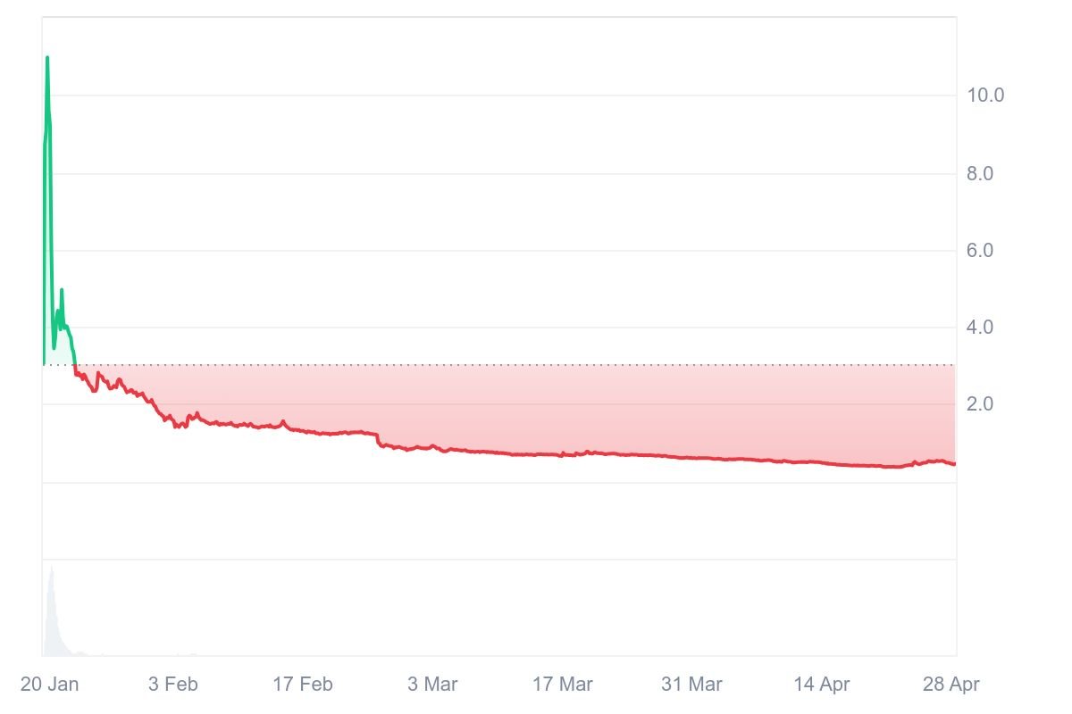 However, the launch of the TRUMP token and its disappointing performance may have marked the end of the memecoin supercycle, which saw the weekly usage activity on memecoin launchpad Pump.fun stage a significant decline — from 2.85 million active wallets on the week of Jan. 20, to just 1.44 million as of March 31.