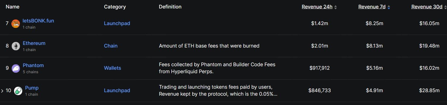 While LetsBonk is gaining traction, Pump.fun remains dominant in other aspects. DefiLlama data shows that the memecoin platform remains the top launchpad in 30-day protocol revenue, earning nearly $29 million.
