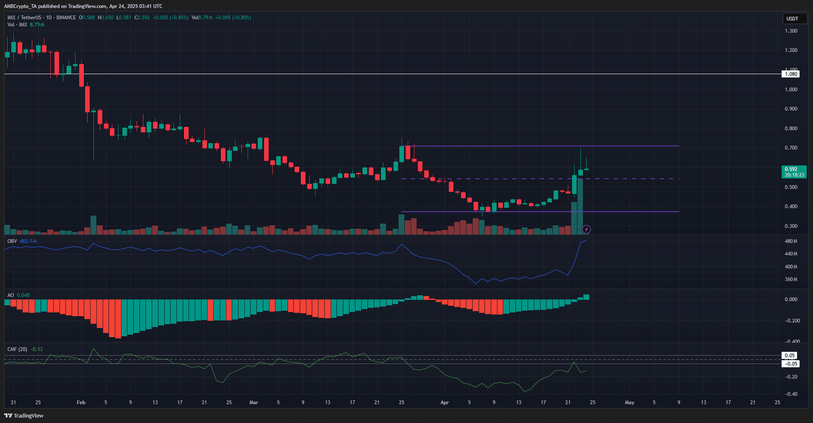The IMX range formation extended from $0.37 to $0.71. The mid-range level at $0.545 acted as support, then as resistance, towards the end of March. Over the past couple of days the price surpassed this resistance too.