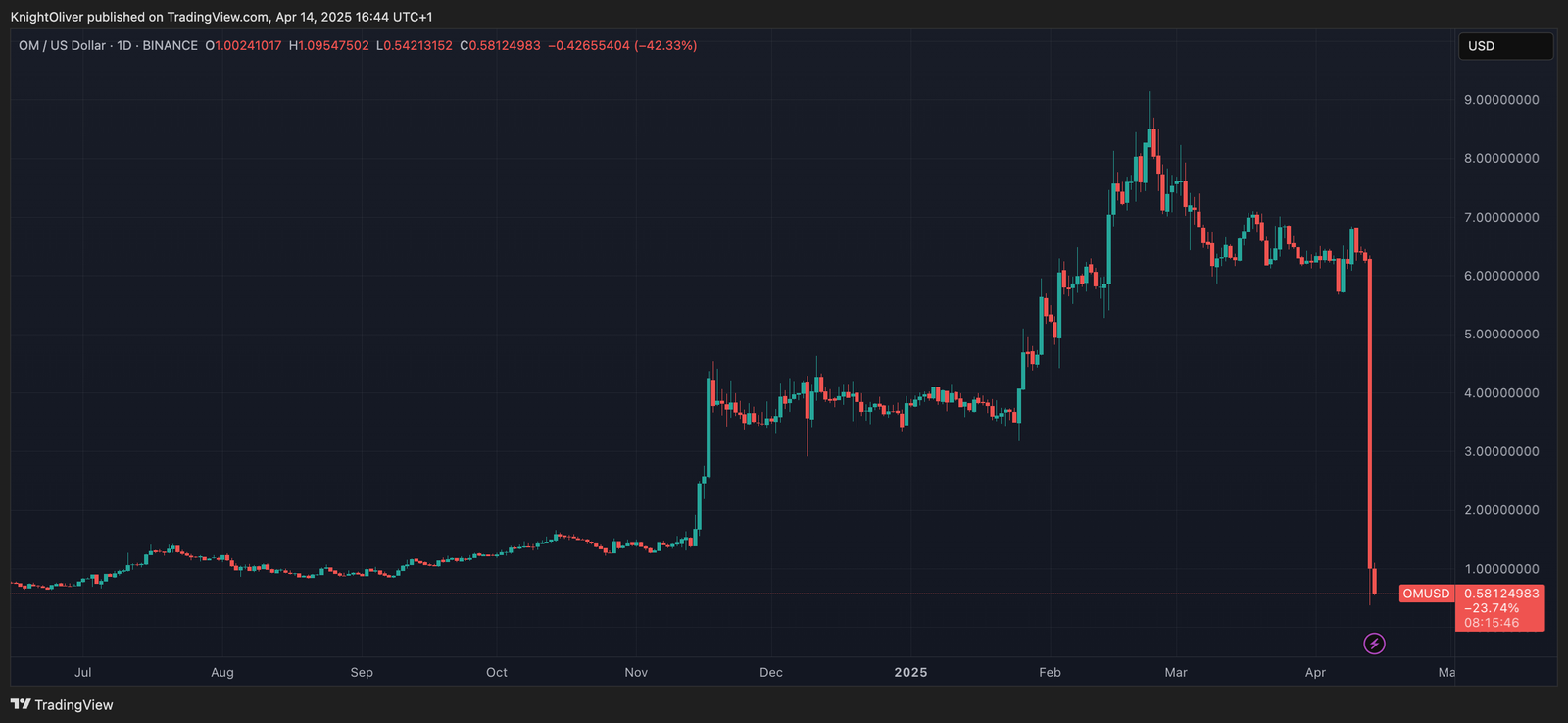 OM is currently trading at $0.57, down 90% from the day’s high of $6.14 as trading volume has increased by 3,425% to $2.6 billion, according to CoinMarketCap.