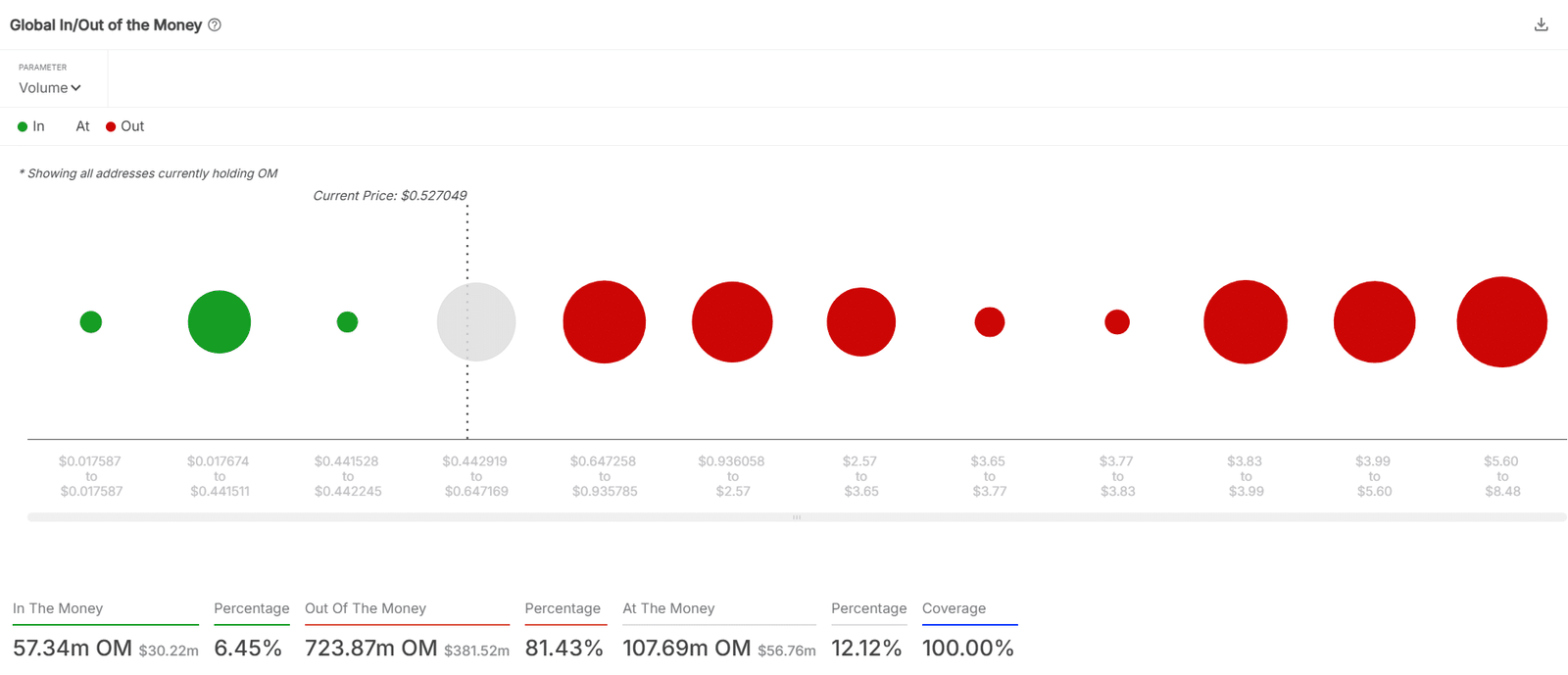 According to the Global in/out of the money model, 81.43% of OM addresses are now holding at a loss. Only 6.45% remain in profit, while 12.12% of wallets are at breakeven. This revealed that a vast majority of participants might be trapped in negative positions. The overwhelming loss concentration only adds immense pressure to the market.