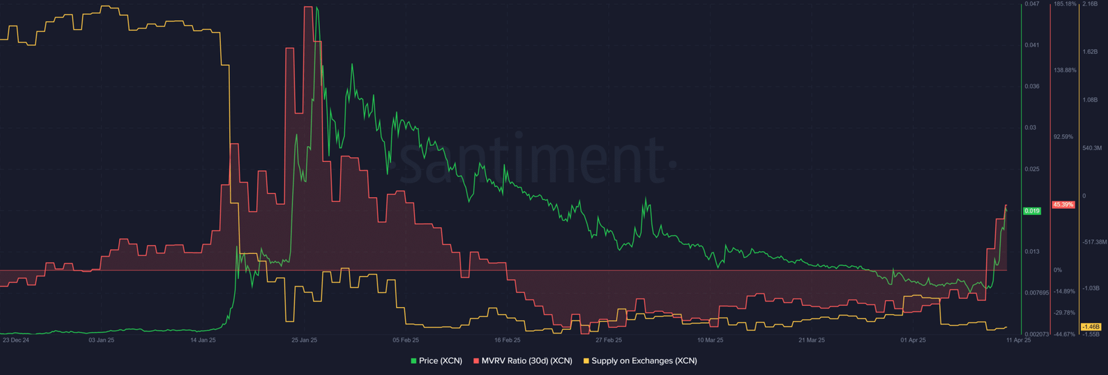 However, there was low selling pressure at press time from these profitable holders. According to Santiment’s Supply on Exchanges metric, the declining trend (yellow) meant more XCN tokens were withdrawn from exchanges than deposited for sell-offs.