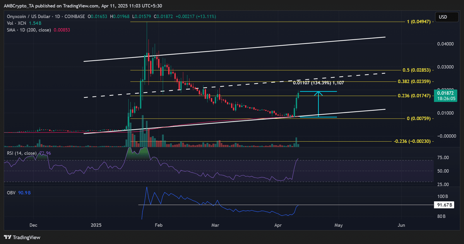 Bulls could extend the rally to the mid-range channel near $0.02 if the OBV clears the overhead hurdle above 91 billion. That would be a potential 25% gain.