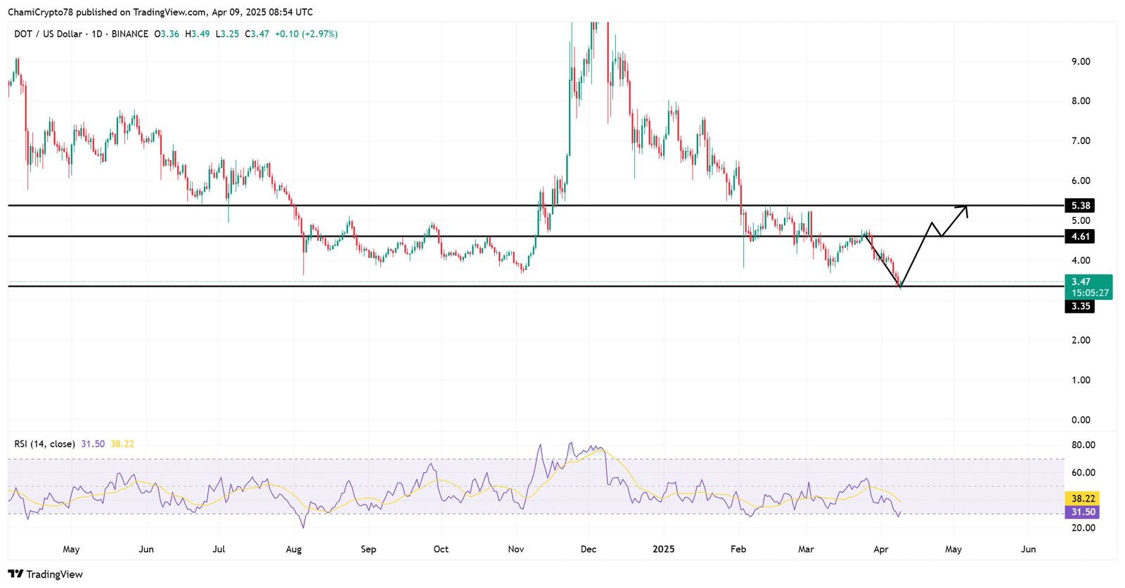 DOT recently bounced from the $3.35 support, which aligns with historical demand zones. This rebound occurred just as the RSI touched 31.50, signaling oversold conditions.