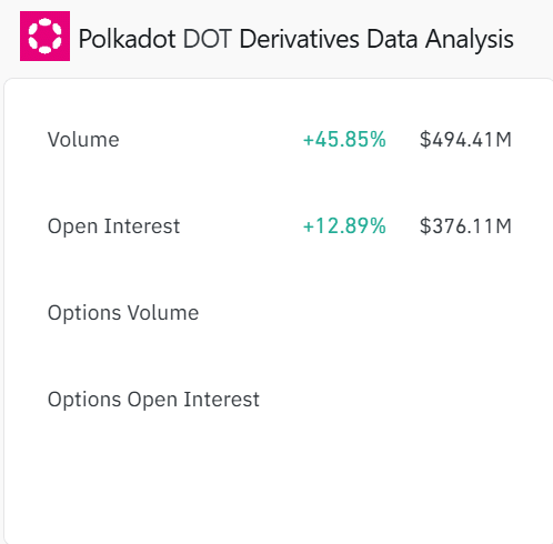 DOT’s derivatives data continues to show aggressive long positioning. Trading volume surged by +45.85% to $494.41 million, while Open Interest jumped +12.89% to $376.11 million.