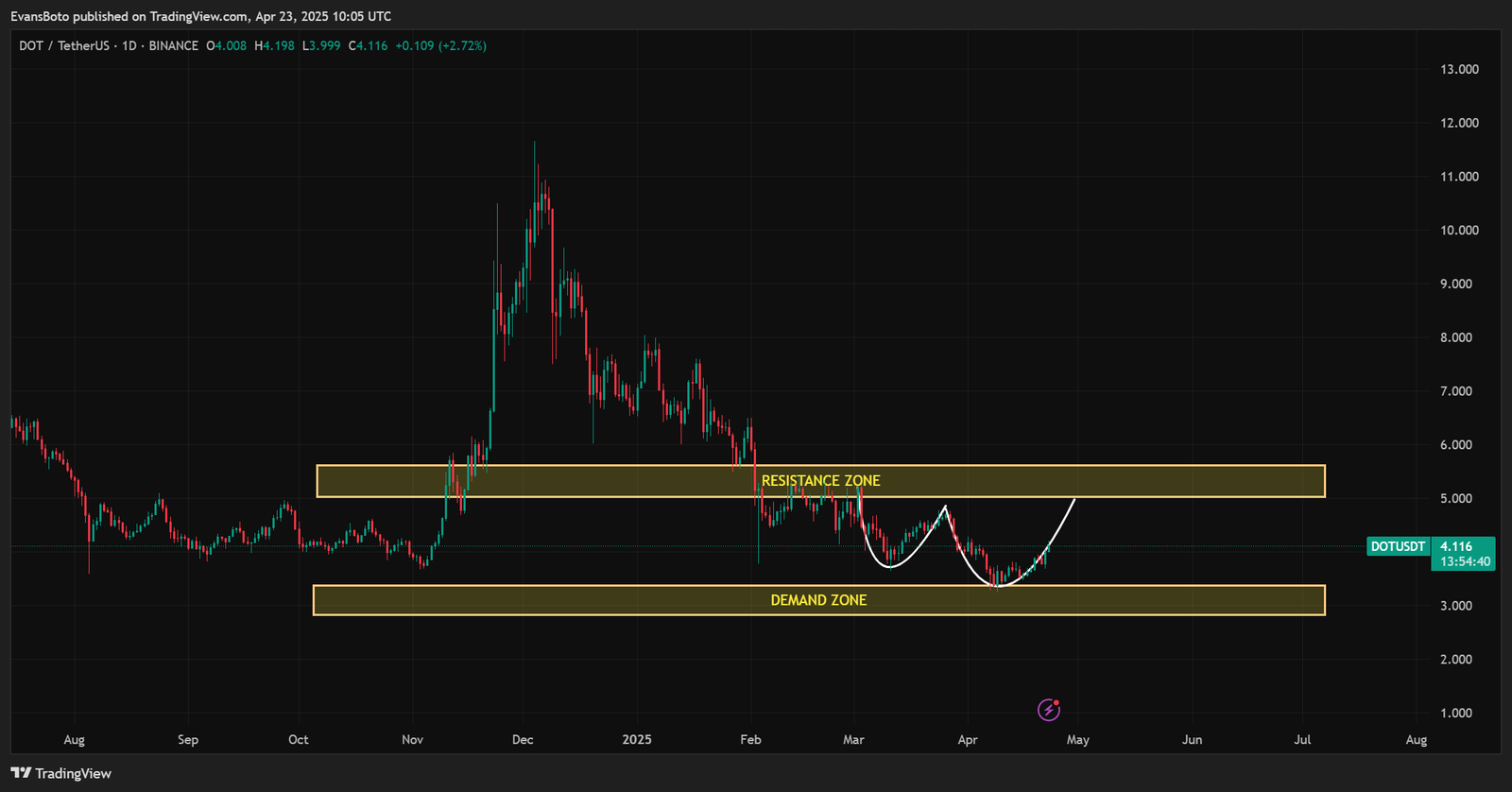 The asset is carving out a classic cup-and-handle pattern above its key demand zone, signaling a potential trend continuation. At the time of writing, DOT traded at $4.11, marking a strong 9.21% daily increase.