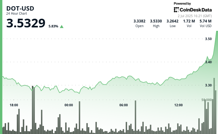 In recent trading, DOT was 7.2% higher over 24 hours, trading around $3.57.
