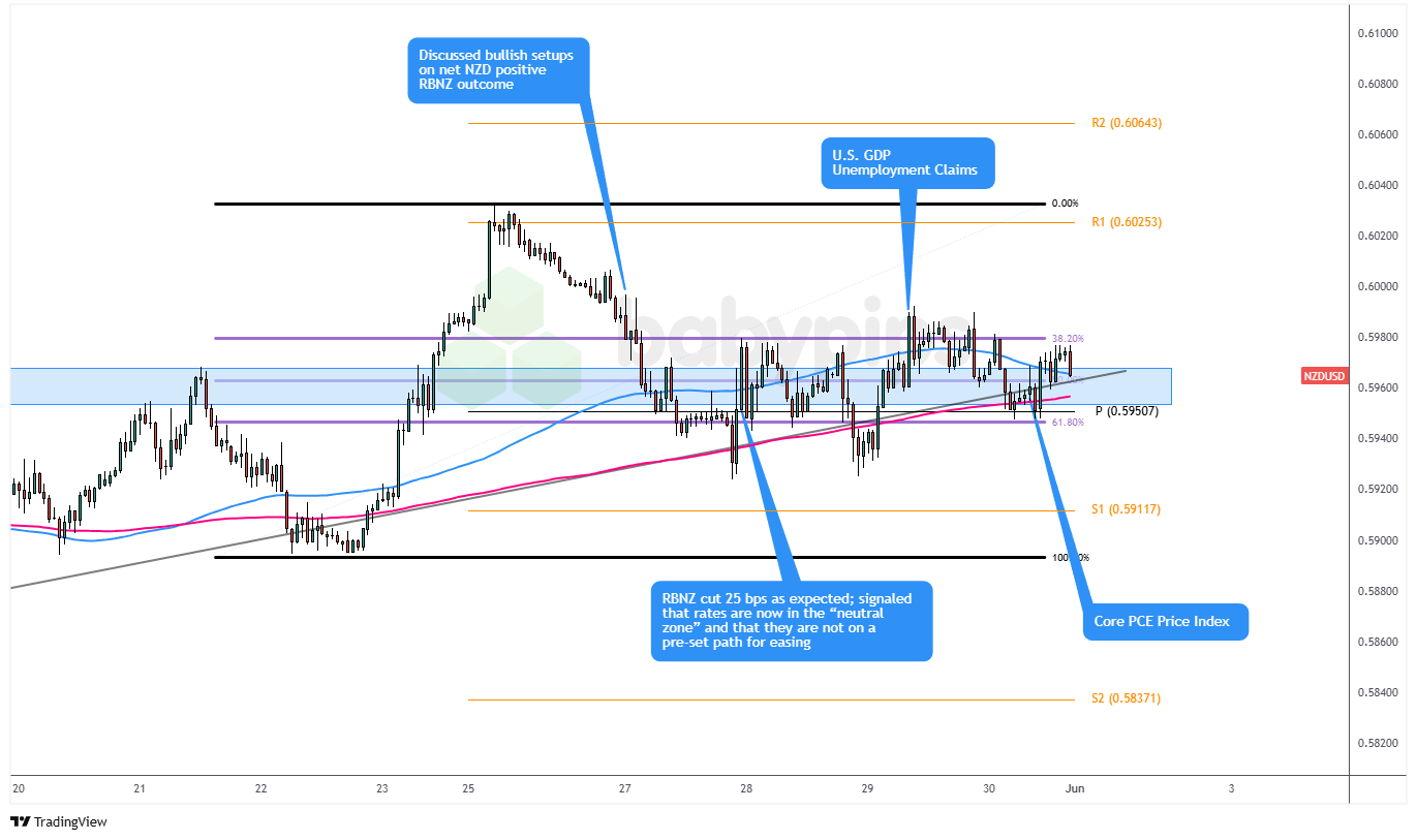 By Friday’s close, NZD/USD had pulled back toward the .5950 pivot point support area as Trump’s social media blast accusing China of violating their trade agreement, combined with cooler US PCE inflation data, created a challenging environment for risk assets despite the RBNZ’s optimistic undertones.