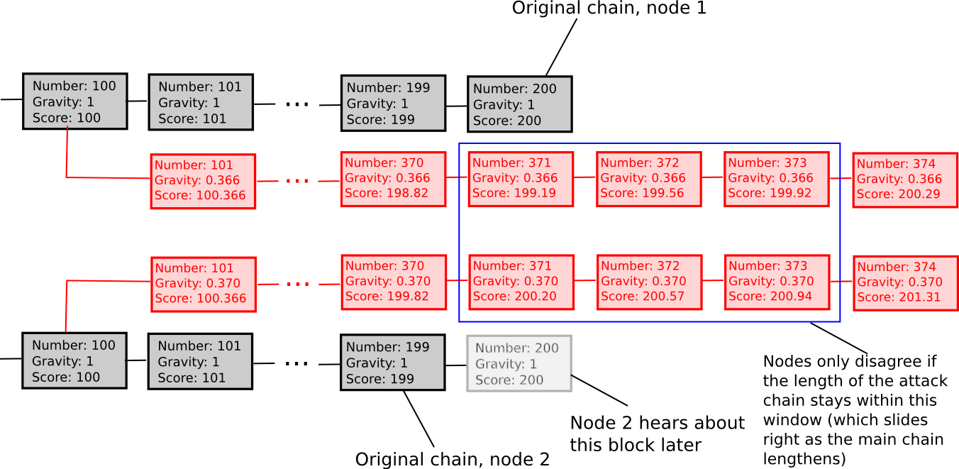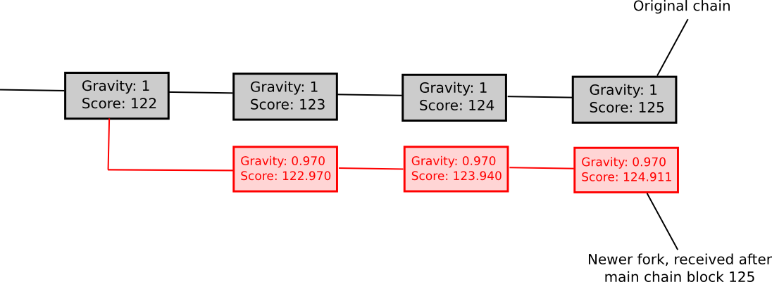 - If a node sees a new block B’ with B as parent, then if n is the length of the longest chain of descendants from B at that time, gravity(B’) = gravity(B) * 0.99 ^ n (note that values other than 0.99 can also be used).