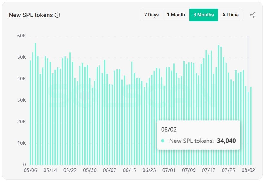 Solscan data showed that on Saturday, there were only about 34,040 Solana Program Library (SPL) tokens minted in Solana. This was the lowest daily mint recorded in the last three months.