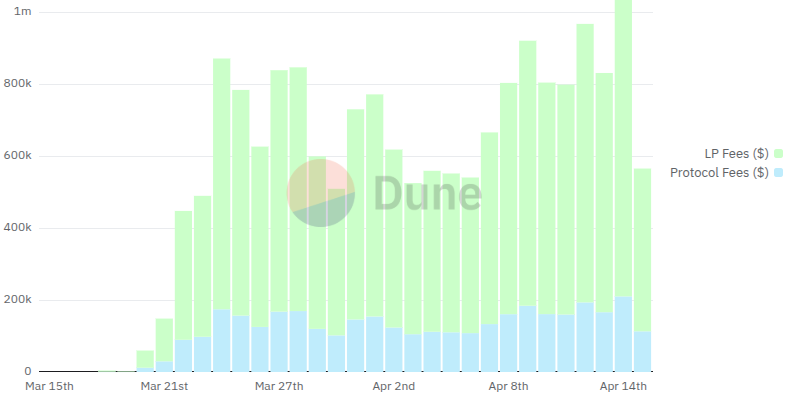 PumpSwap’s income is growing alongside its trading volume, with Dune data showing that daily fees reached a record of over $1.05 million on April 14. That day, $840,000 were liquidity provider fees and $210,000 protocol fees.