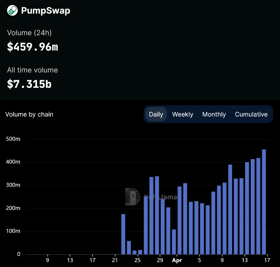 PumpSwap’s daily record in trading volume has now been broken five days in a row after posting $460 million on April 17.