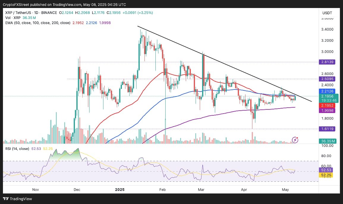 - XRP is approaching a critical resistance at $2.21, where the 50-day and 100-day EMAs converge alongside a descending trendline from January.