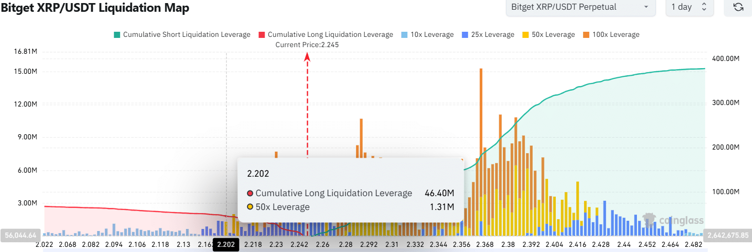 XRP at $2.245 struggled to break support, which could trigger liquidations and push the price to $2.10 or lower.