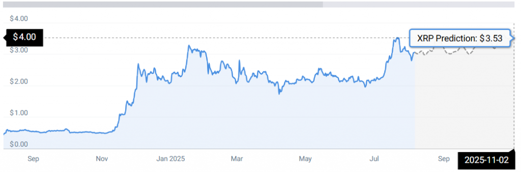 Per CoinCodex, Shiba Inu’s three-month analysis shows a buildable momentum. XRP is leading the charge, with its chart showcasing a pathway leading the token to sit at $3.53 by November 3, 2025.