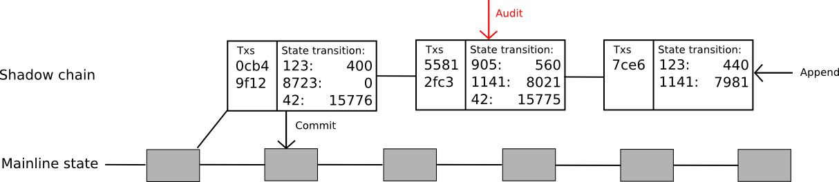 To solve that problem, the protocol can be extended even further. Now, the idea is to create an entire “shadow chain”, with computations happening off-chain but state transitions being committed back to the main chain after 100 blocks. Oracles can add new blocks to the “tail” of the chain, where a block consists of a list of transactions and a [[k1, v1], [k2, v2] … ] list of state transitions caused by those transactions. If a block is unchallenged for 100 blocks, the state transitions are applied automatically to the main chain. If the block is successfully challenged before it is committed then that block and all children are reverted, and the block and all children lose their deposits with part going to the auditor and part to the void (note that this creates extra incentive to audit, since now the author of the child of a shadow block would prefer to audit that shadow block lest they be caught up in the author’s potential malfeasance). The code for this is much more complicated than the other examples; a complete but untested version can be found here.