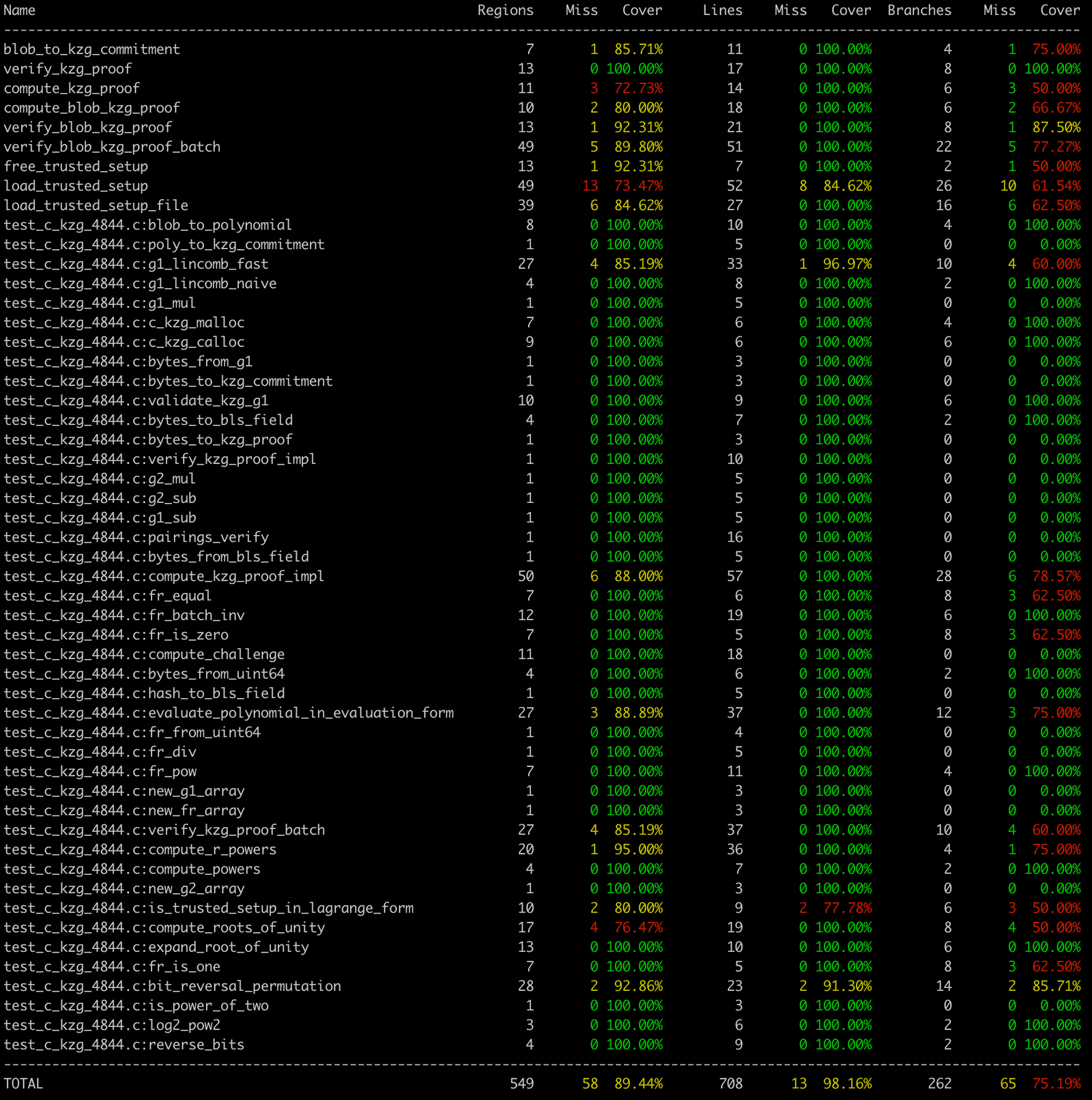 Next, we used llvm-profdata and llvm-cov to generate a coverage report from running the tests. This is a great way to verify code is executed (“covered”) and tested. See the coverage target in c-kzg-4844’s Makefile for an example of how to generate this report.