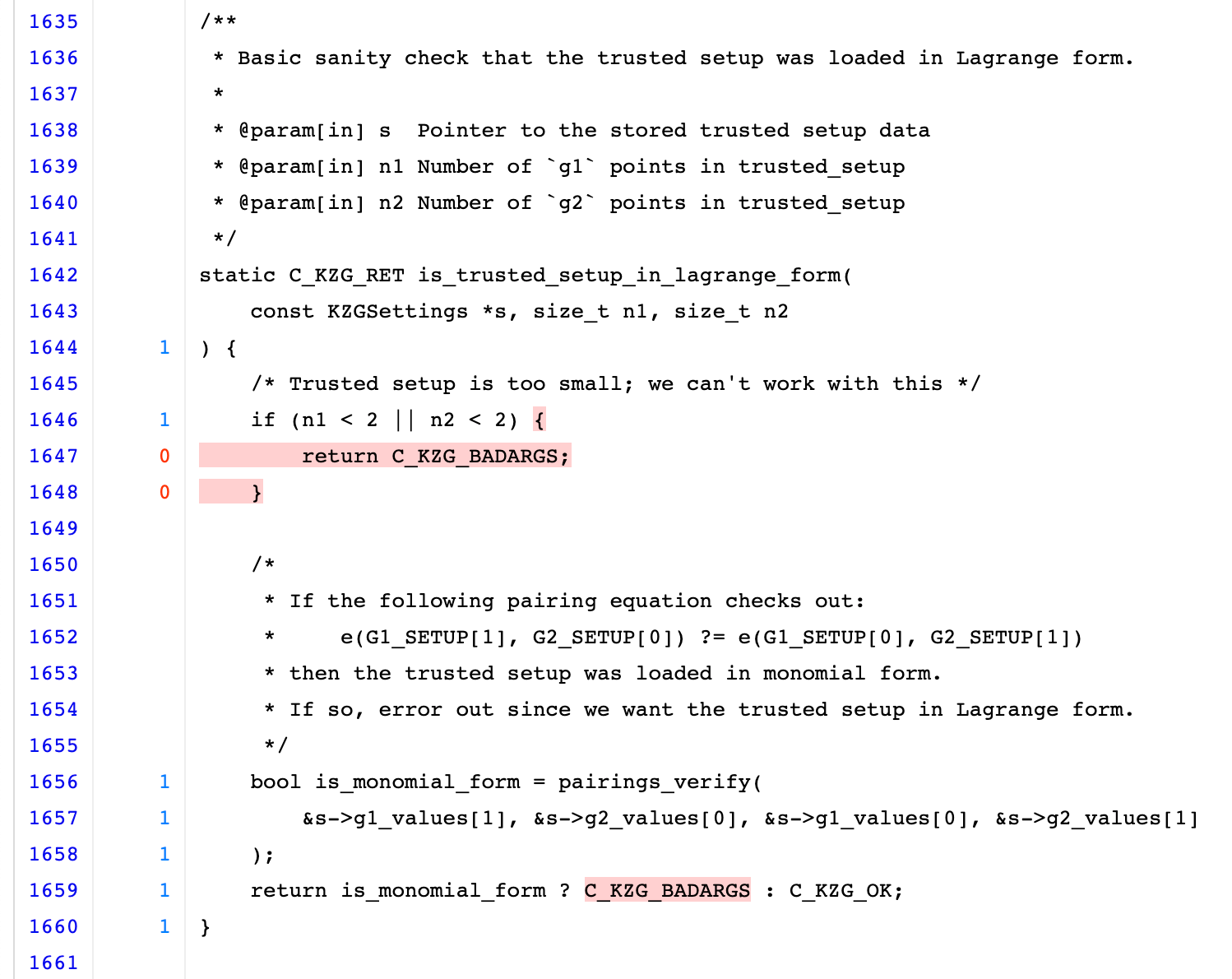 At the beginning of this function, it checks that the trusted setup is big enough to perform a pairing check. There isn’t a test case which provides an invalid trusted setup, so this doesn’t get executed. Also, because we only test with the correct trusted setup, the result of is_monomial_form is always the same and doesn’t return the error value.